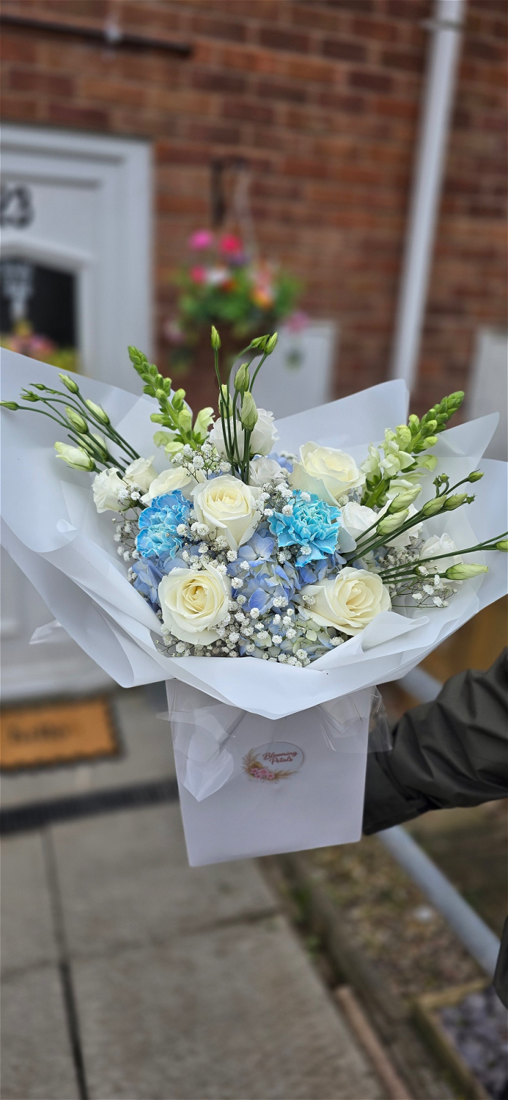 A beautiful blue and white bouquet, thoughtfully arranged to celebrate the arrival of a precious baby boy. Soft, elegant and full of love — the perfect way to say congratulations on your new little bundle of joy