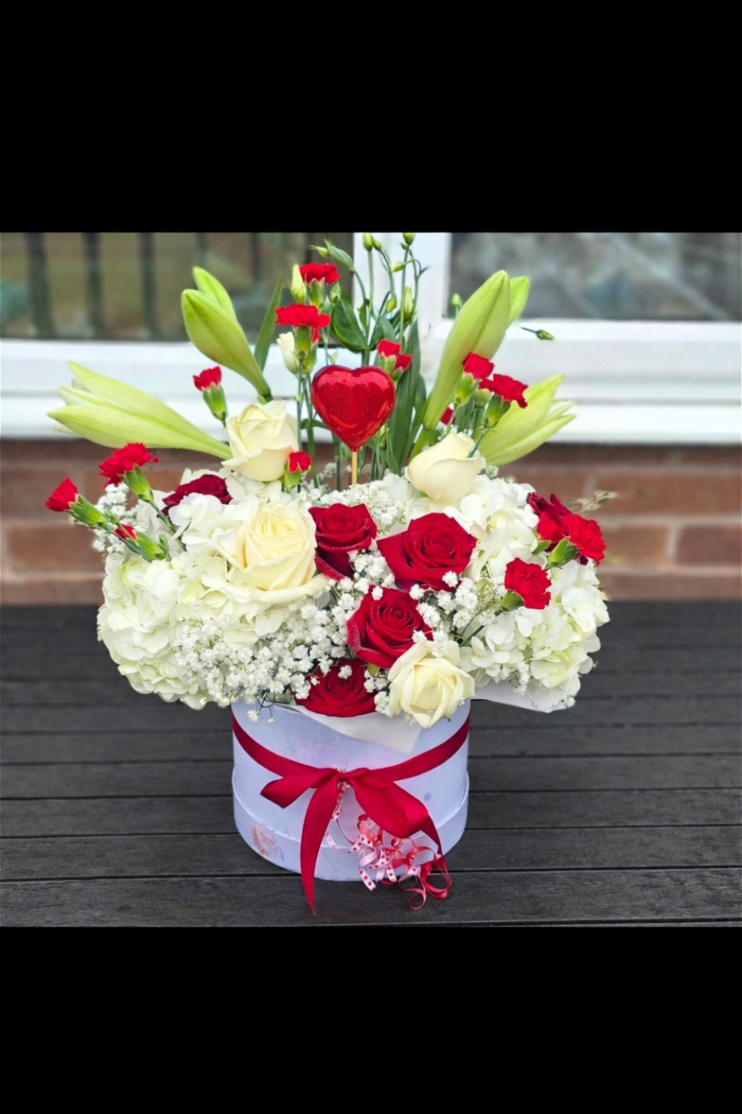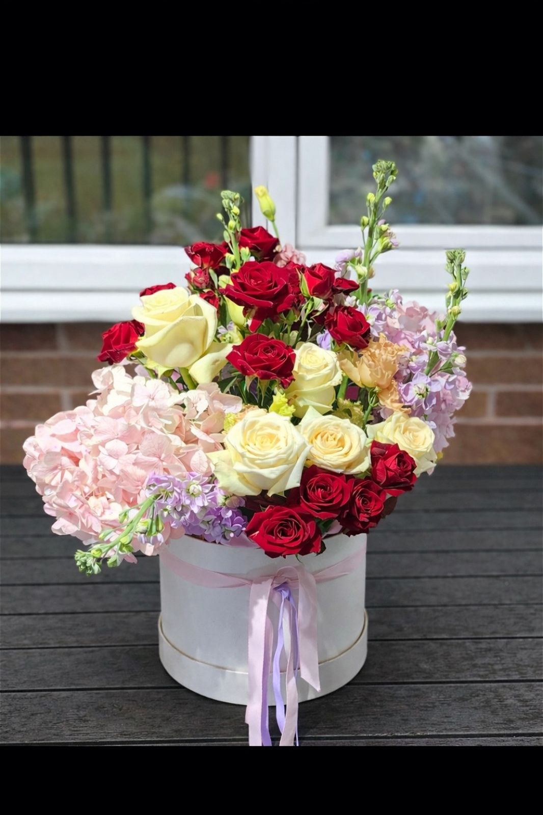 A refined expression of elegance, our Luxury Hat Box Floral Arrangement features hand-selected premium blooms artfully arranged in a sophisticated keepsake hat box. Lush, full, and beautifully balanced, it arrives ready to display — no vase needed.